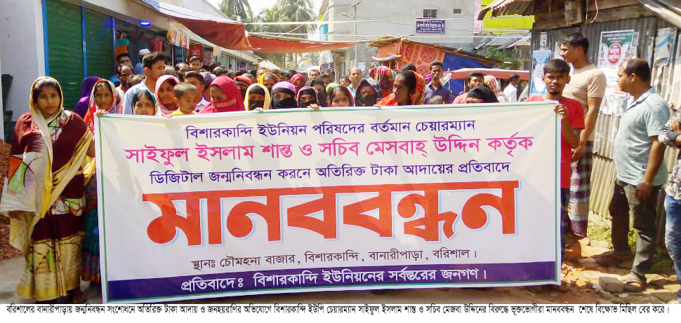 বানারীপাড়ায় জন্মনিবন্ধন সংশোধনে অতিরিক্ত টাকা আদায় ইউপি চেয়ারম্যান ও সচিবের বিরুদ্ধে ভূক্তভোগীদের মানববন্ধন ও বিক্ষোভ মিছিল