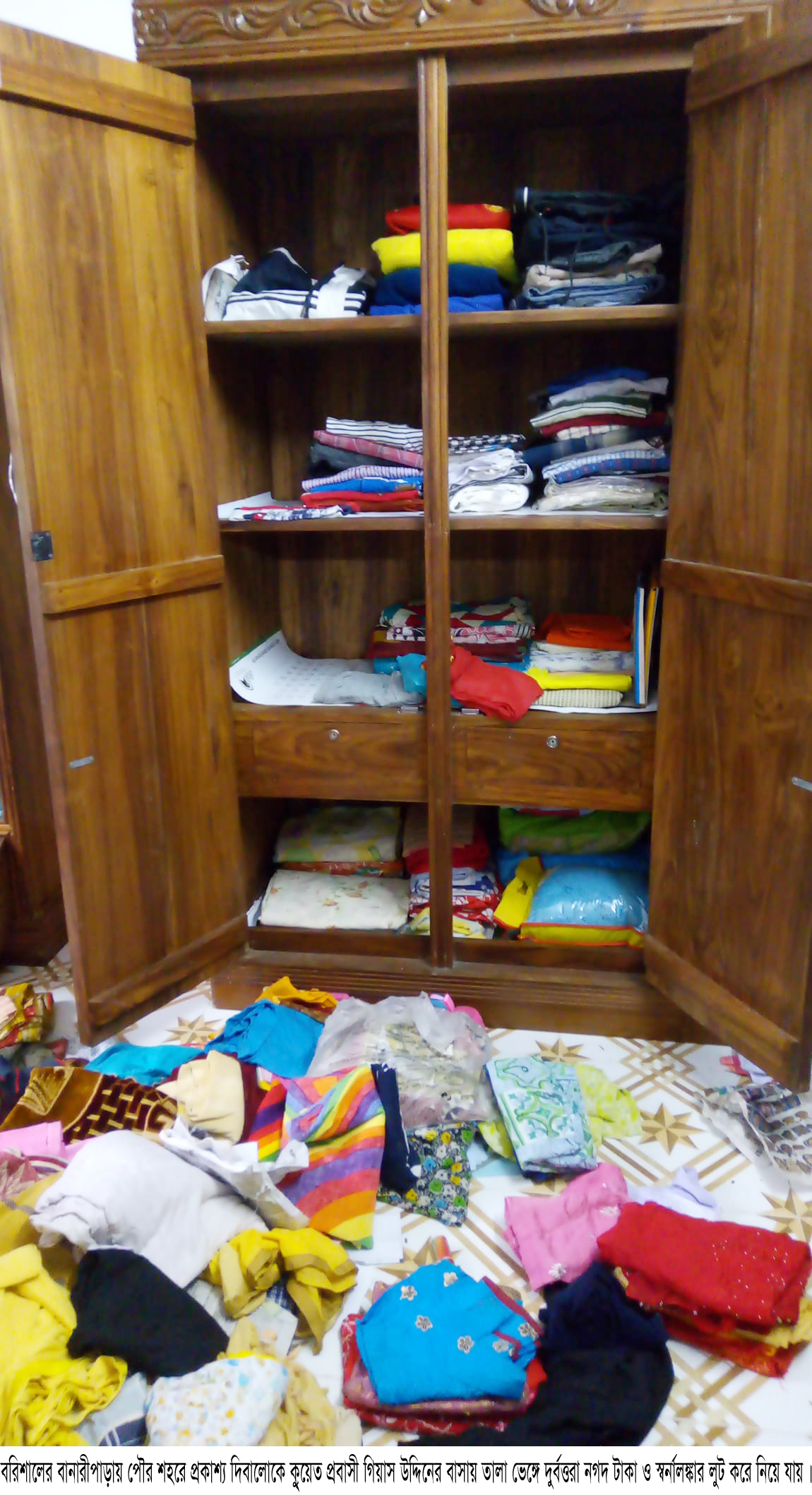 রাহাদ সুমন,বানারীপাড়া(বরিশাল)প্রতিনিধি॥ বরিশালের বানারীপাড়ায় পৌর শহরে প্রকাশ্য দিবালোকে গিয়াসউদ্দিন নামের এক কুয়েত প্রবাসীর বাসায় দুঃসাহসিক চুরি সংঘটিত হয়েছে। চোরের দল ওই বাসা থেকে নগদ ৩০ হাজার টাকা ও ৫ ভরি স্বর্নালঙ্কার লুট করে নিয়ে গেছে। জানা গেছে, প্রতিদিন সকাল সাড়ে ১০টায় কুয়েত প্রবাসী গিয়াস উদ্দিনের স্ত্রী রেবা তার শিশু পুত্রকে নিয়ে বানারীপাড়া মাহমুদিয়া মাদ্রাসায় যান এবং দুপুর দেড়টায় মাদ্রাসা ছুটির পরে বাসায় ফেরেন। ২৮ মে শনিবার সকাল সাড়ে ১০টায় প্রতিদিনের মত তিনি ছেলেকে নিয়ে মাদ্রাসায় যান। এ সুযোগে অজ্ঞাত দুর্বৃত্তরা পৌর শহরের ৯ নম্বর ওয়ার্ডের কলেজ মোড় লাগোয়া তার বসত বিল্ডিংয়ের তালা ভেঙ্গে ভিতরে প্রবেশ করে সুকেস,কাঠের আলমিরা ও ওয়ারড্রপ ভেঙ্গে নগদ ৩০ হাজার টাকা ও ৫ ভরি স্বর্নালঙ্কার লুট করে নিয়ে যায়। দুপুরে ২টা ১০ মিনিটের দিকে তার বৃদ্ধা শাশুড়ি গিয়ে বাসার দরজার তালা ভাঙ্গার বিষয়টি দেখতে পেয়ে ছোট ছেলে নুরউদ্দিনকে জানান। নুরউদ্দিন মুঠোফোনে তার ভাবী রেবাকে বিষয়টি অবহিত করলে তিনি বাসায় ফিরে টাকা ও স্বর্নালঙ্কার চুরি হওয়ার বিষয়টি জানতে পারেন। খবর পেয়ে থানার উপ-পরিদর্শক স্বপন চন্দ্র দে ঘটনাস্থল পরিদর্শন করেন। এ প্রসঙ্গে বানারীপাড়া থানার অফিসার ইনচার্জ (ওসি) মো. হেলাল উদ্দিন বলেন, তদন্তপূর্বক প্রয়োজনীয় আইনানুগ ব্যবস্থা গ্রহণ করা হবে। প্রসঙ্গত ১৪ মে পৌর শহরের ৬ নম্বর ওয়ার্ডে বন্দর বাজারের মুরগির ফিড ব্যবসায়ী বেল্লাল হাওলাদারের বাসায় গভীর রাতে দুর্বত্তরা হানা দিয়ে নগদ ২ লাখ ৩২ হাজার টাকা ও ৭ ভরি স্বর্নালঙ্কার লুট করে নিয়ে যায়। গত ৩০ মার্চ উপজেলার সলিয়াবাকপুর ও চাখারে এক রাতে যুক্তরাষ্ট্র প্রবাসীসহ দুই বাসা ও একটি ব্যাংকে সিরিজ ডাকাতির ঘটনা ঘটে। ডাকাতদল শর্টগান,৩৫ রাউন্ড গুলি,২৬ ভরি স্বর্নালঙ্কার,নগদ ১১ লক্ষাধিক টাকা,দুটি আইফোনসহ ৫ টি দাবি মোবাইল ফোন,ল্যাপটপ ও ৬৫ ইউএস ডলার সহ বিভিন্ন মালপত্র লুট করে নিয়ে যায়। এছাড়াও বানারীপাড়া পৌর শহরসহ উপজেলার বিভিন্ন ইউনিয়নে প্রায়ই চুরির ঘটনা ঘটে। এসব সিরিজ ডাকাতি ও চুরির ঘটনায় এখন পর্যন্ত কেউ গ্রেফতার কিংবা মালামাল উদ্ধার হয়নি। ফলে জনমনে চুরি ও ডাকাতি আতঙ্ক বিরাজ করছে।